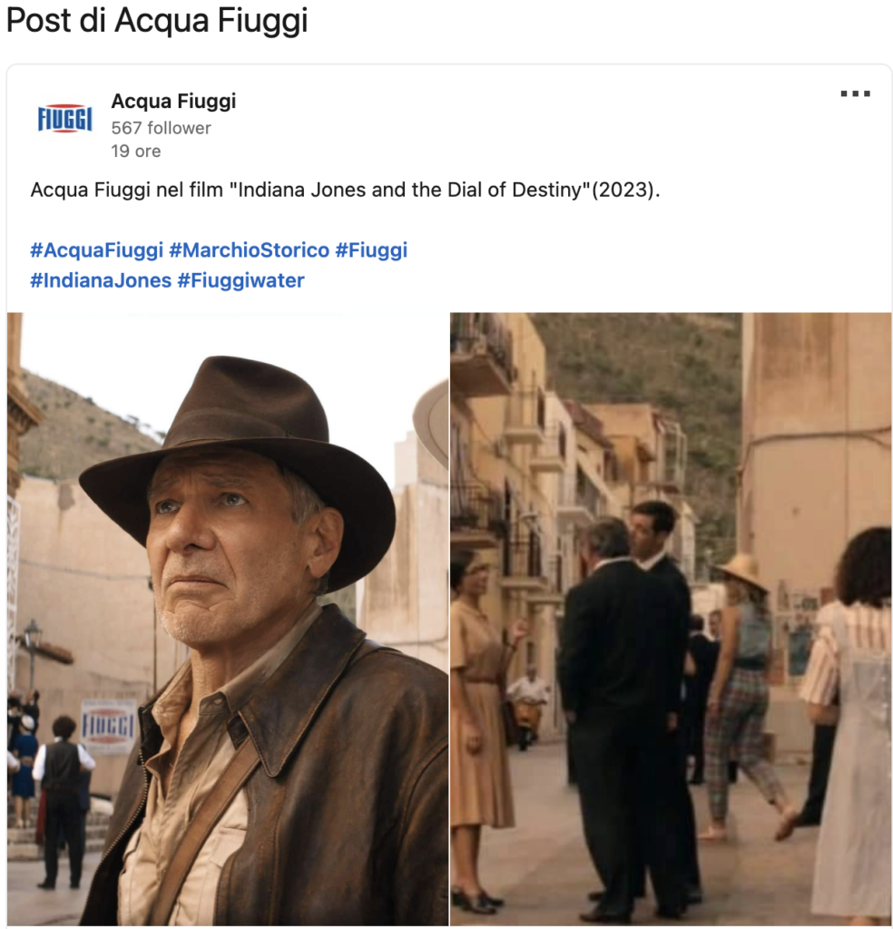 Acqua Fiuggi protagonista in alcune scene del film “Indiana Jones e il Quadrante del destino” con protagonista Harrison Ford. Il lungometraggio distribuito dalla Disney, è uscito nelle sale il 30 giugno dopo la presentazione a Cannes ed ha riscosso molto successo. In diverse scene del film (girate in questo caso in Sicilia) i più attenti hanno notato che c’è il marchio dell’acqua Fiuggi, come si nota in questo post pubblicato sui social.