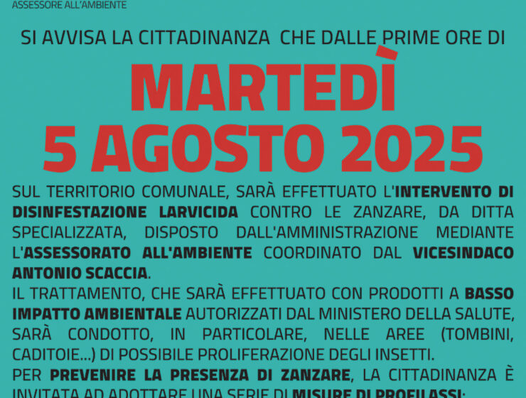 Dalle prime ore di martedì 5 agosto, sul territorio comunale, sarà effettuato l’intervento di disinfestazione…