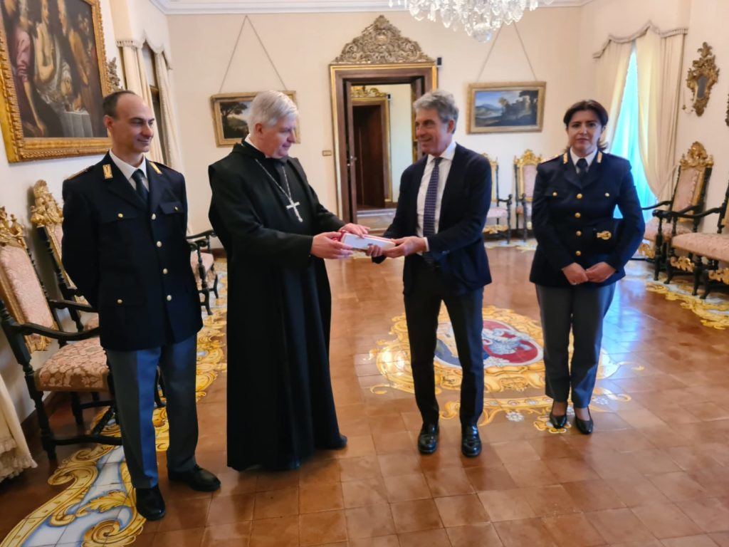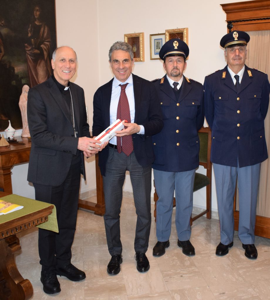 La Questura di Frosinone si è fatta promotrice dell’iniziativa, affinché l’olio possa essere consacrato durante la Santa Messa Crismale e pertanto il Questore di Frosinone, dr. Domenico Condello, ha consegnato le ampolle di olio a S.E. Ambrogio Spreafico, Vescovo di Frosinone – Veroli- Ferentino e Anagni – Alatri, a S.E. Gerardo Antonazzo, Vescovo della Diocesi di Sora- Cassino- Aquino e Pontecorvo e all’Abate di Montecassino Rev. Dom Luca Fallica.