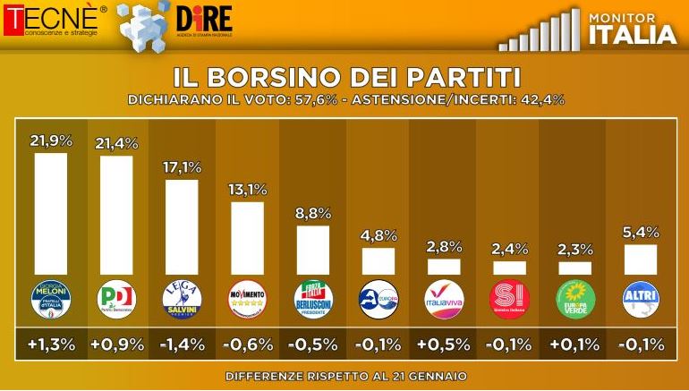 Fratelli d’Italia ottiene +1,3% dal 21 gennaio e con il 21,9% complessivo si conferma primo partito. Precede il PD, secondo col 21,4% (+0,9%). Perdono tutti gli altri, su tutti la Lega terza (-1,4%), ora al 17,1%. Quindi M5S 13,1% (-0,6%) e Froza Italia 8,8% (-0,5). Azione e +Europa sono praticamente stabili (-0,1%) al 4,8%. Avanza Italia Viva (+0,5), ora al 2,8%. Quindi Sinistra Italiana (-0,1%) 2,4% ed Europa Verde (+0,1%) 2,3%.